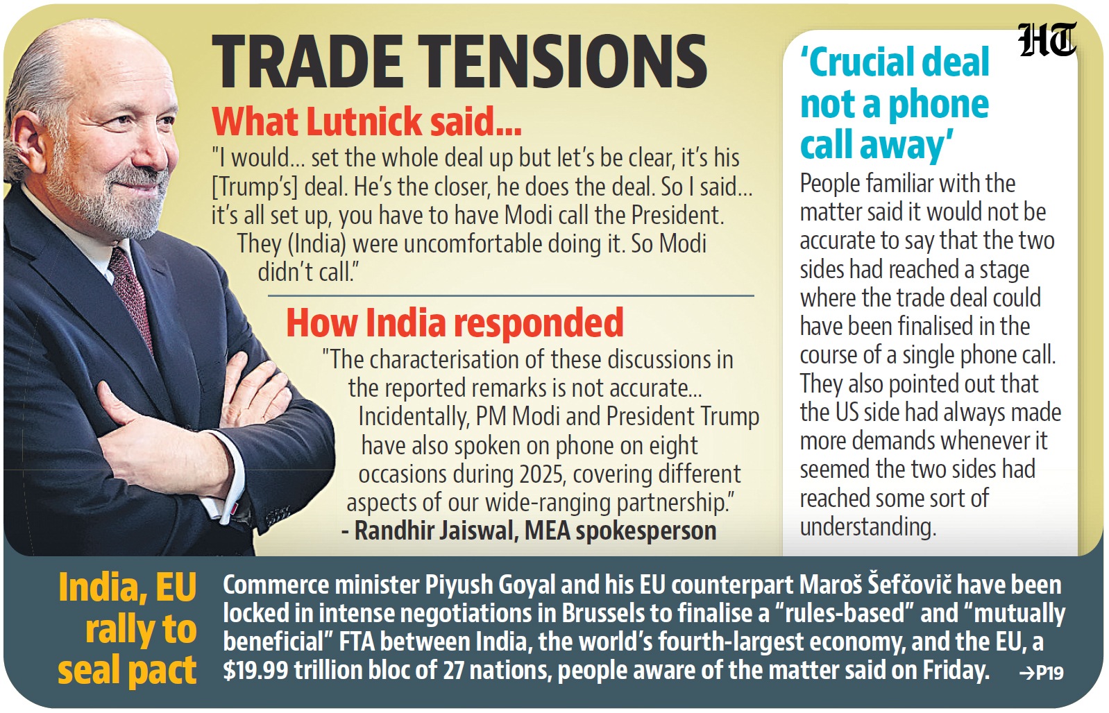Lutnick told a podcast that India had been given “three Fridays” to clinch the agreement, and that Modi had to call Trump to close the pact. At a time when bilateral relations are at a fresh low, Lutnick caused a stir by claiming that the PM “didn’t call” as the Indian side was uncomfortable with the deal.