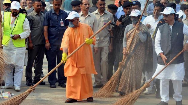 Before the rally, Adityanath swept the road outside the Taj Mahal and then went inside the Mughal era monument in a damage control exercise following the controversy over its place in Indian heritage.