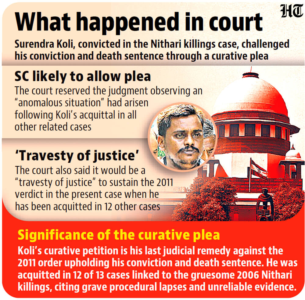 A bench of Chief Justice of India Bhushan R Gavai and justices Surya Kant and Vikram Nath reserved its verdict on Koli’s curative petition, while remarking: “This matter deserves to be allowed in a minute.”