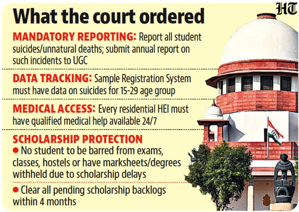 Using its Article 142 powers, which allow the court to pass any order in the interest of complete justice, the bench directed that Sample Registration System data on suicides be maintained by all HEIs for the 15-29 age group. It also ordered the National Crime Records Bureau (NCRB) to distinguish between school student suicides and those in higher education.