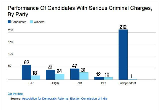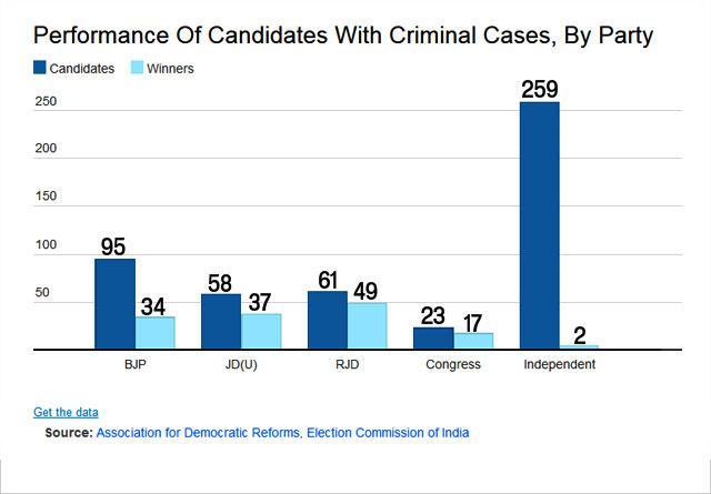 As many as 61 (60%) out of 101 candidates of the RJD, 23 (56%) out of 41 candidates of the Congress and 259 (23%) out of 1,150 independent candidates had declared criminal charges against them in their affidavits.