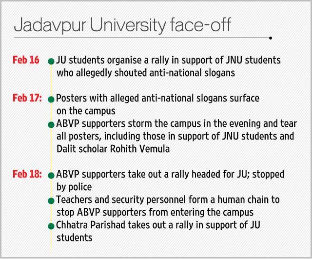 Teachers formed a human chain to avert a clash between ABVP and Left supporters at Jadavpur University (JU) on Thursday while a state BJP spokesperson filed a PIL in the Calcutta high court seeking the arrest of university students who allegedly changed anti-national slogans.