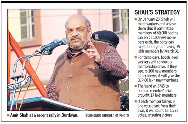 On January 23, Shah will meet workers at the SK Memorial hall and advise them that if committee members of 60,000 booths can enroll 100 new members each, the party can meet its target of having 75 lakh members by March 31.