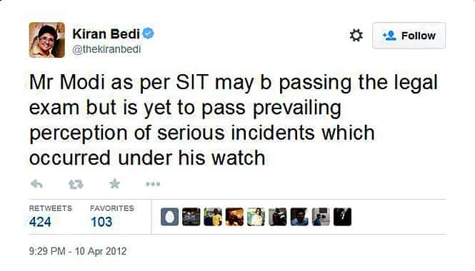 This wasn't the first time she had done so. On April 10, 2012, Bedi had in a tweet reminded Modi that the special investigation team probing the riots had cleared him but that was not the end of the matter.