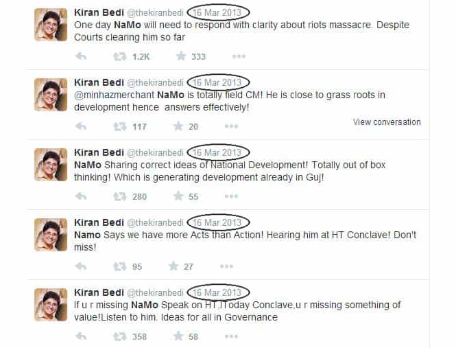 Within minutes Twitter was flooded with screenshots and links to Bedi's tweets questioning Modi's role in the 2002 Gujarat riots when he was the state's chief minister. Tweets with screenshots pointed out that on March 16, 2013 Bedi had tweeted: "One day NaMo will need to respond with clarity about riots massacre. Despite Courts clearing him so far."