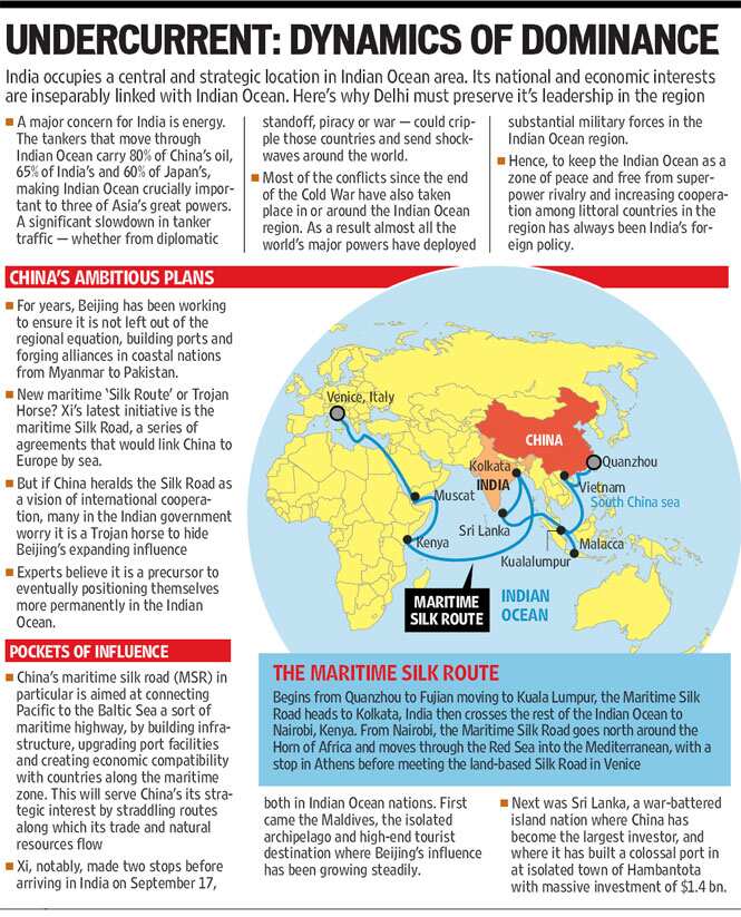 “China wants to be a major player in the Indian Ocean, alongside India and the US” said Kanwal Sibal, a former Indian foreign secretary who also held a series of ambassadorships. Xi’s latest initiative is the maritime Silk Road, a series of agreements that would link China to Europe by sea. But if China heralds the Silk Road as a vision of international cooperation, many in the Indian government worry it is a Trojan horse to hide Beijing’s expanding influence, said Sibal, who is well-connected in New Delhi’s foreign policy circles. “It is a precursor to eventually positioning themselves more permanently in the Indian Ocean,” he said.