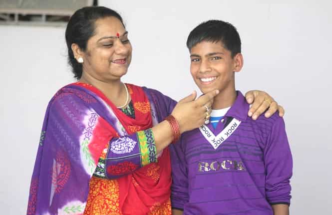 Abhishek (Right) standing with his teacher Ruchi Shrotriya. (Deepak Gupta/HT Photo)