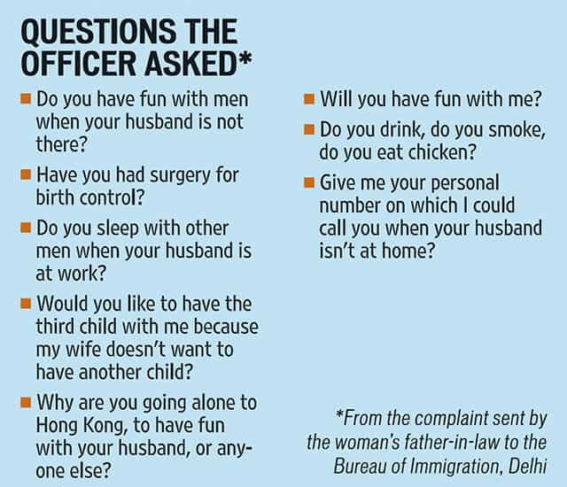While reviewing her passport, the officer, Vinod Kumar, allegedly asked the woman several inappropriate questions, including if she slept with other men when her husband was at work and if she wanted to have her third child with him.