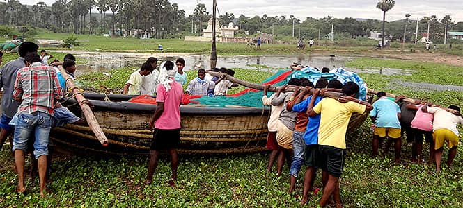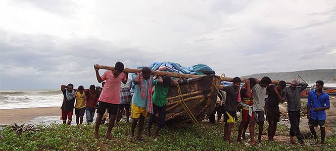 Fishermen of Chapalavuppada move their vessels further inland to avoid damage due to the storm surge which can even take the boat into the sea. (Prasad Nichenametla/HT Photo)