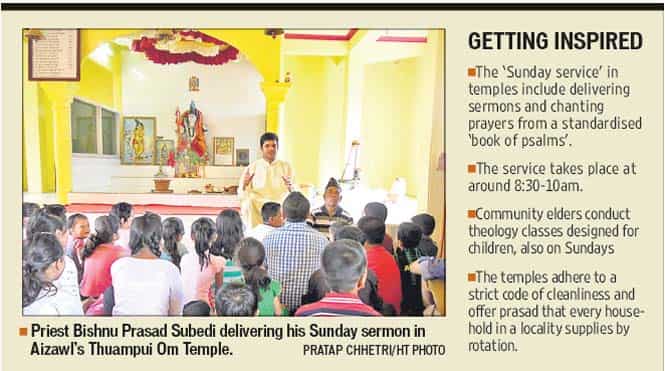 Inspired by the church, Hindu temples in Mizoram now conduct similar ‘Sunday service’ for various deities. Community leaders say it is a case of ‘doing what the Romans do in Rome’ and adapting to a more convenient way of connecting with the gods and goddesses.