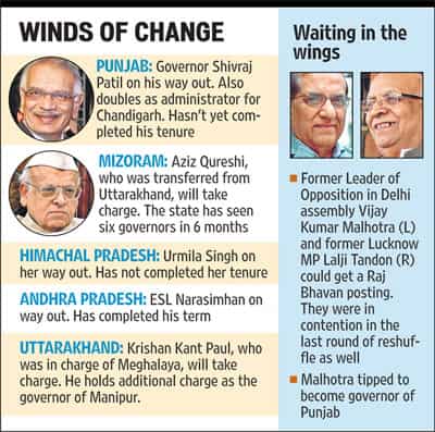Punjab governor Shivraj Patil, who also doubles as administrator for Chandigarh, Himachal Pradesh governor Urmila Singh and Andhra Pradesh governor ESL Narasimhan may be on their way out, according to sources.