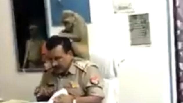 Monkey looks for lice in UP cop’s hair while he works. Watch bizarre video