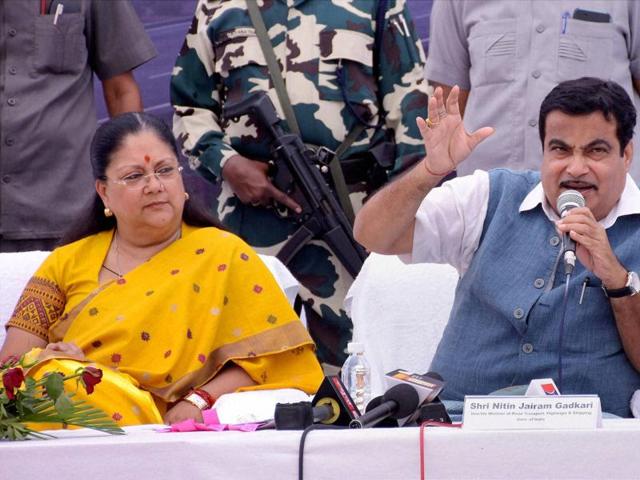 Nitin Gadkari with Rajasthan chief minister Vasundhara Raje addressing the press conference in Kotputli district of Jaipur on Thursday. (PTI photo)