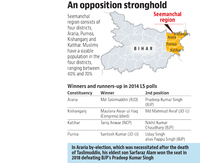 All India Majlis-e-Ittehadul Muslimeen (AIMIM) national president Asaduddin Owaisi and his younger brother Akbaruddin Owaisi’s fiery speeches are also believed to be polarising Hindu votes in the four districts in Seemanchal, where Muslim electorate ranges from 30 to 70 %.