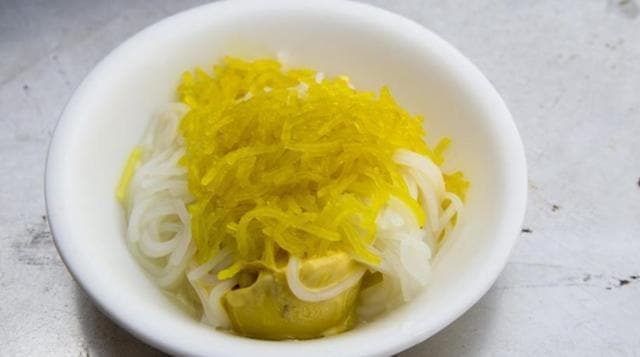 6. Now add saffron water and colour to the syrup. Mix the boondis, syrup and dry fruits.