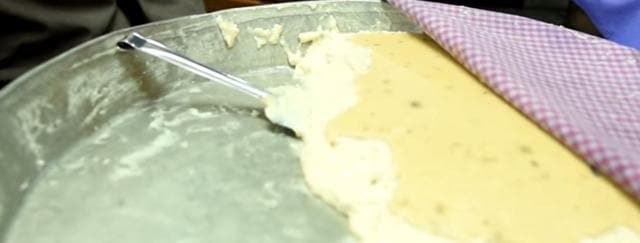1. Make a thin batter with gram flour and water. Heat the ghee in a pan.