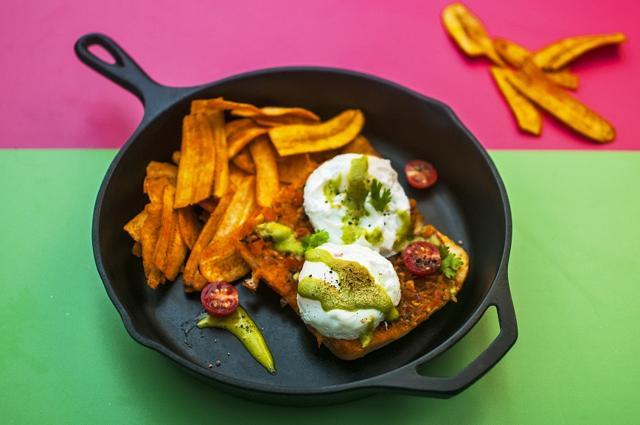 Mumbai masala Benedict: In this Indian version of the English breakfast staple, two perfectly poached eggs are placed on top of crusty masala pav and topped with spicy green chutney hollandaise.