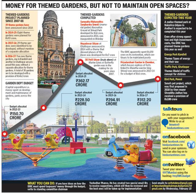 In 2014-15 budget alone, the BMC had announced the development of eight themed gardens for a cost of Rs93 crore. This financial year, too, the BMC has announced two new themed gardens in Kandivli and Ghatkopar. Last year, three such themed gardens were developed at the cost of Rs20 crore.