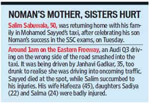 While the driver of the taxi died on the spot, Noman’s father Salim succumbed to his injuries at the Sion hospital. His mother Hafeeza, 45, and sisters Sadiya, 22, and Salma, 24, were badly injured and are recuperating at Saifee Hospital.