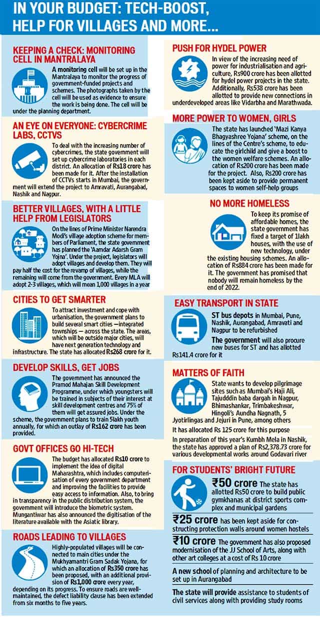 Terming it an “output-based budget” rather that expenditurebased, Mungantiwar announced to set up a monitoring mechanism to plug holes in the system while spending the allocation. The control room at Mantralaya will monitor all infrastructure and development projects by using evidence from real-time photographs. “This will help up in utilising the money for the purpose it is meant for,” he said.