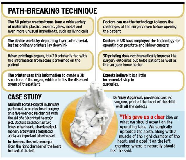 Mulund’s Fortis Hospital in January performed a complex heart surgery on a five-year-old Palghar girl with the aid of a 3D printed heart. Doctors said she had two holes in her heart, a hardened pulmonary artery and a misplaced aorta, an important blood vessel.