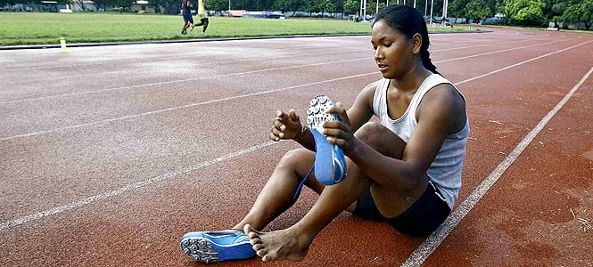 Swapna Barman removes her track shoes after a practice session at Salt Lake stadium in Kolkata. (Reuters Photo)