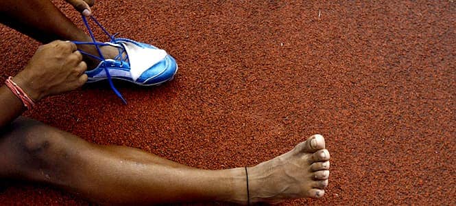 Swapna Barman prepares to wear her track shoes before a practice session at Salt Lake stadium in Kolkata. (Reuters Photo)