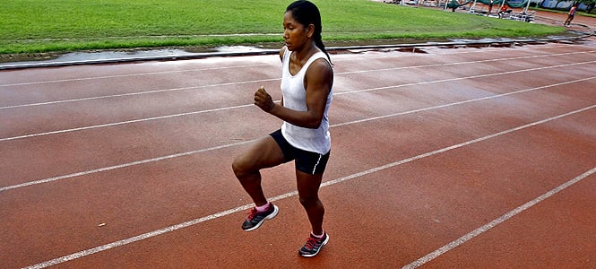 Swapna Barman runs during a practice session at Salt Lake stadium in Kolkata. (Reuters Photo)