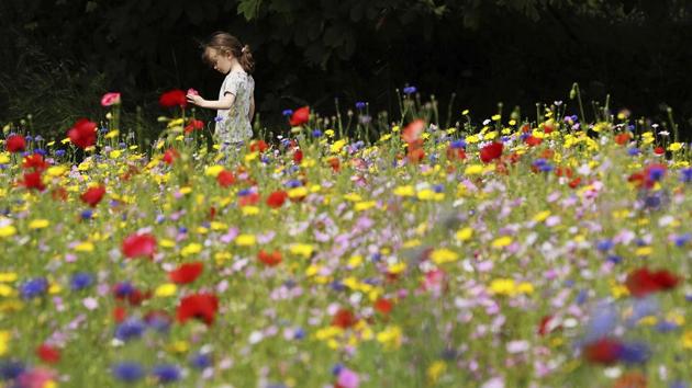 Three-year old Anna May Byrne plays in a field of wild flowers on Dublin's northside, Ireland, as the sun shines on this years summer solstice, Saturday June 20, 2020. (AP/Brian Lawless)