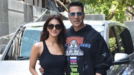Akshay Kumar, in a funky sweatshirt and trousers, promotes BellBottom with Vaani Kapoor. She wore a one-shoulder bodysuit and cargo