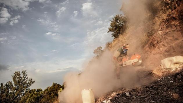 Johannesburg Witwatersrand University professor Jonah Choiniere grinds stones containing fossils on the outskirts of Rosendal, South Africa. As the sun rises over the South African bush, scientists laden with backpacks climbed up a hillside. They get down to work, carving into two immense blocks of stone that have concealed the secrets of an ancestor of modern-day crocodiles for some 200 million years. (Gianluigi Guercia / AFP)