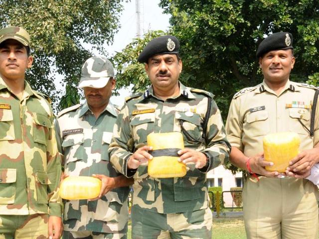 Giving details, BSF DIG (Amritsar sector) MF Farooqui said jawans of the border guarding force at Udhar Dhariwal BOP swung into action when they noticed a group of three-four persons approaching the barbed wire fence from the Pakistan side after crossing the international border. “When the intruders neared the fence they started throwing the contraband they were carrying over the fence,” he added.
