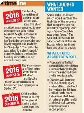 The UT administration has turned down the demand of the judges of the Punjab and Haryana high court to make additions in their houses in Sector 24. UT chief architect, Kapil Setia, in his communiqué to the high court’s registrar general on October 13 has said the proposed changes were ‘not desirable’. In August, the registrar general had sought these changes in six houses in Sector 24 occupied by the judges.