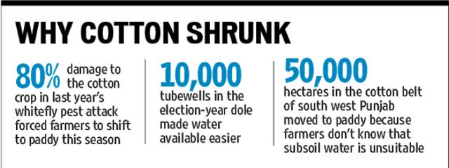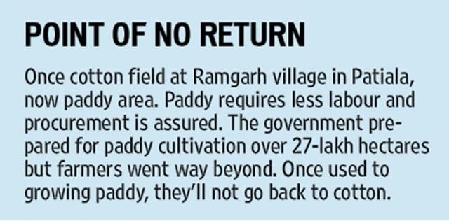 Cotton experts feel helplessness. “What can we do? We can’t impose anything on farmers,” said Pankaj Rathore, director of the PAU’s research centre in Faridkot. “Paddy’s invasion into cotton area which is not a good trend, because the subsoil water is brackish and the other conditions are also not conducive. Also, once farmers get used to growing paddy, it is difficult to bring them back to cotton. Paddy requires less labour.”