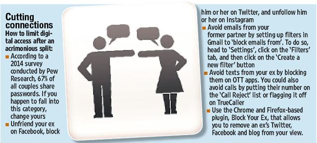 Vrushali Patil, 28, shares her story. The IT consultant blocked her ex, who she had dated for four years, on her social networking sites after a bitter split. “He was constantly liking and commenting on my posts, and begging me to get back together. It was embarrassing,” she says. In her case, even blocking didn’t work. “He’d send me emails, texts, WhatsApp messages and even post pictures of us together on Instagram. I felt harassed, but didn’t know how to make it stop,” she says, adding that the online stalking stopped only six months later, when her ex started dating someone else.