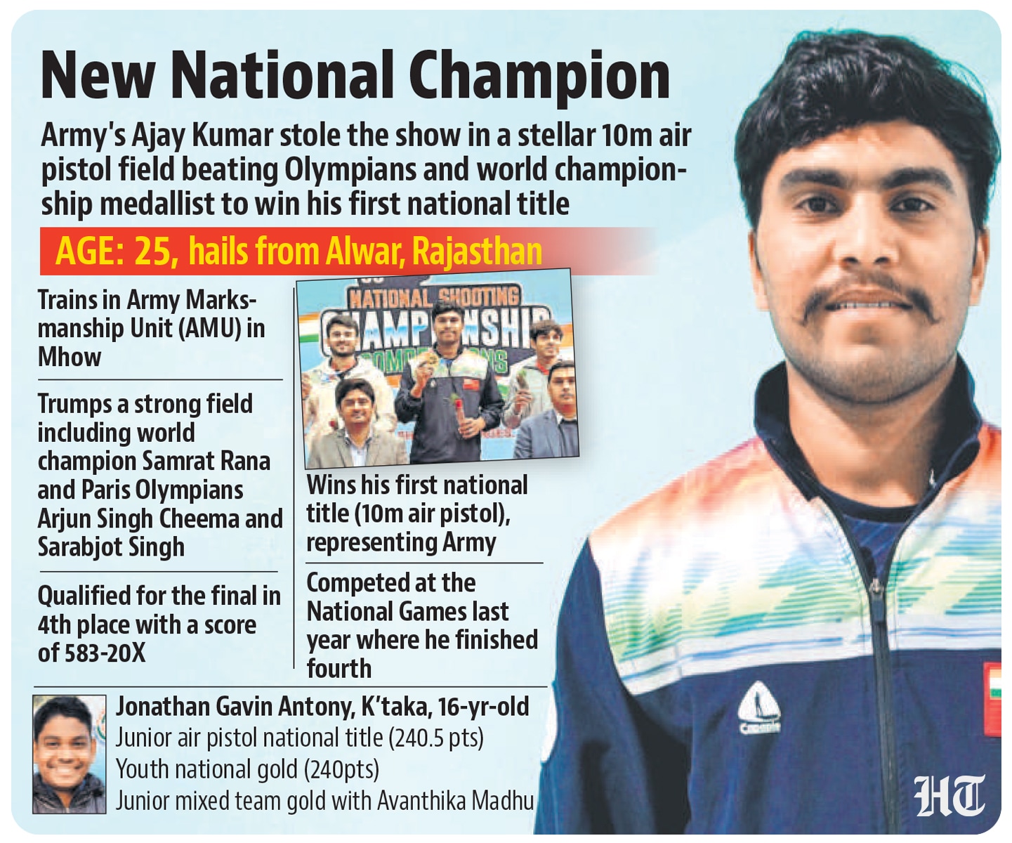 Ajay Kumar Ambawat wins the 10m air pistol national title, outshining top competitors at the championships in New Delhi, marking his senior final debut.