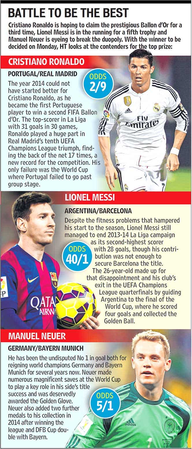 Cristiano Ronaldo is the favourite to win the Ballon d'Or for the second year in succession at Monday's gala ceremony in Zurich ahead of Manuel Neuer and Lionel Messi. Who do you think will win the Ballon d'Or for 2014-15? Vote here