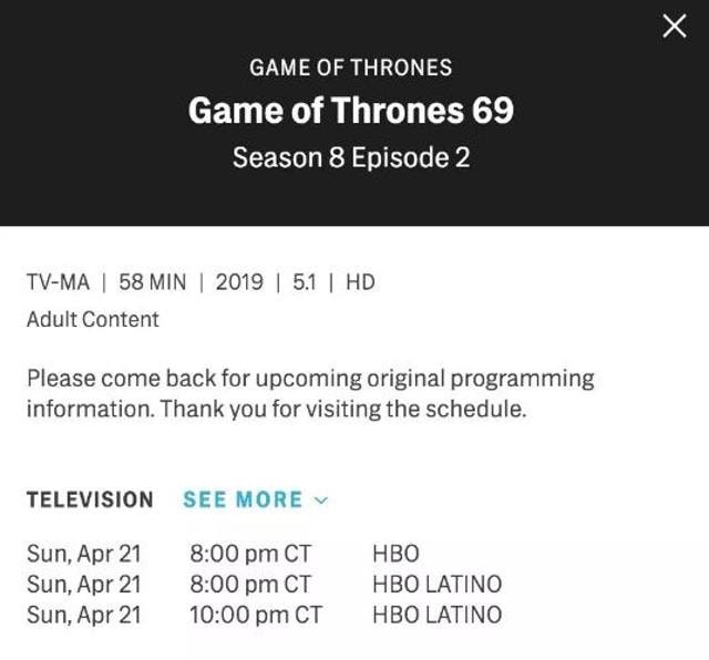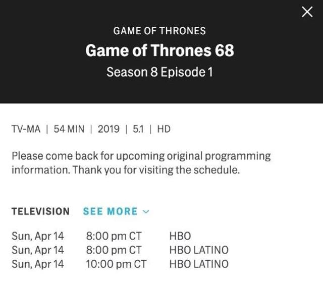 When you toggle ahead to April 14 -- that’s the premiere date for season 8 -- you can select the season premiere and learn that it’s a 54-minute episode. Similarly, toggle further down and you’ll find that episode two is 58 minutes long. But to find out the runtimes of the remaining four episodes, you’ll need to alter the url of the pop-ups manually. For example, if the code at the end of episode two is 811556, changing it to 811557 will give you details about episode three.