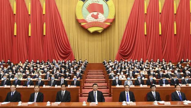 Key leaders sat in two rows behind Li’s podium, well spaced and without face masks. Officials behind were more closely packed and wearing masks, as were the hundreds listening in the hall.