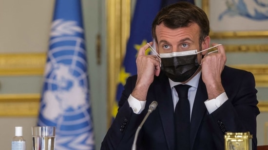 French President Emmanuel Macron adjusts his face mask as he attends a video conference meeting. (AFP)