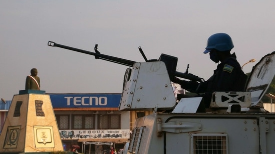 A peacekeeper from the United Nations Multidimensional Integrated Stabilization Mission in the Central African Republic (MINUSCA) armoured personnel carrier (APC) keeps guard as they patrol the streets ahead of the upcoming elections in Bangui, Central African Republic December 26, 2020. REUTERS/Antonie Rolland NO RESALES. NO ARCHIVES (REUTERS)
