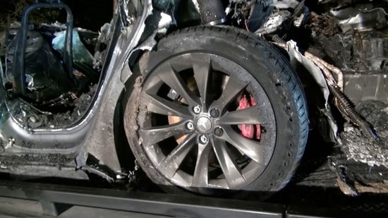 The remains of the Tesla Model S after it crashed in Texas. (Reuters)