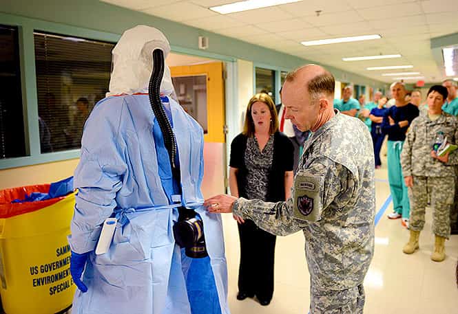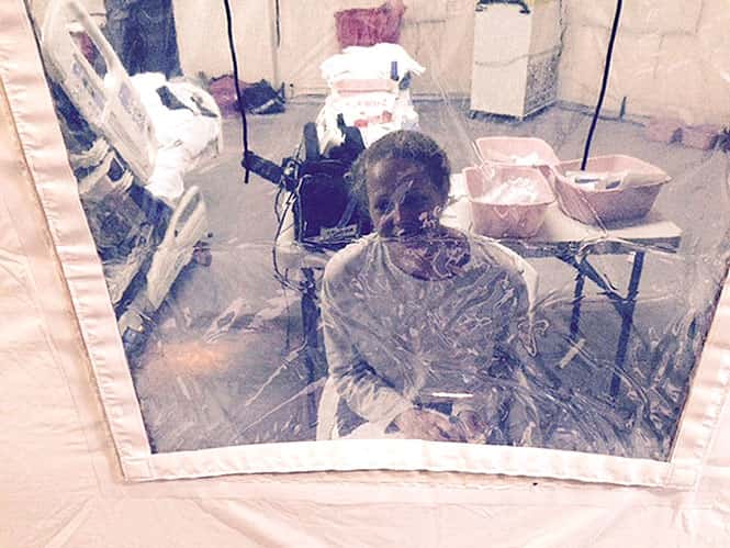 Ebola is not airborne. It is transmitted through blood, vomit, diarrhea and other bodily fluids. Healthcare workers in West Africa have been among the hardest hit by the outbreak.