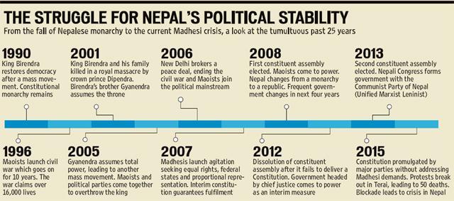 This year should have gone down as a landmark year in Nepal’s history. Ending a seven-year process and after two elections, the country adopted its first Constitution prepared by an elected constituent assembly in September. But two other events ensured that 2015 will be remembered more for things other than the statute. The first was the devastating earthquakes in April and May that claimed nearly 9,000 lives. The border blockade by Madhesis to protest against the Constitution and the resulting crisis is the other. The residents of the Terai plains bordering India, who comprise nearly 30% of Nepal’s population, feel the Constitution doesn’t guarantee equal rights to them. They want proportional representation in state organs, delimitation of constituencies, fresh demarcation of federal boundaries so that the stretch in the Terai from east to west falls within two Madhes states and a change in citizenship laws.