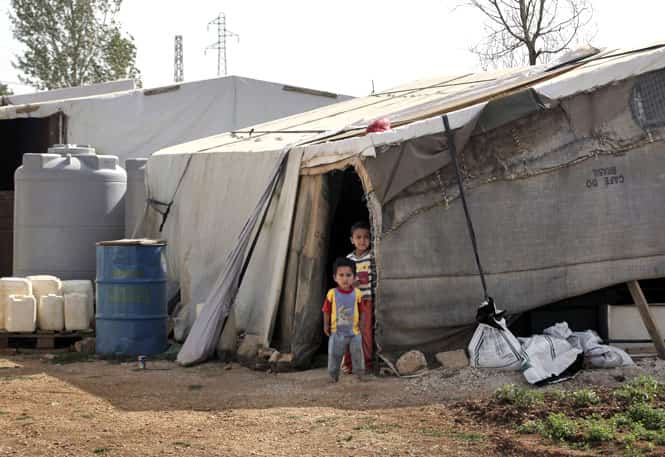 Syrian refugee children stand outside their tent at a Syrian refugee camp in the eastern Lebanese town of Majdal Anjar, Lebanon. (AP Photo)