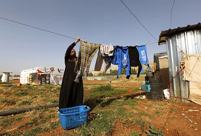A Syrian refugee woman hangs laundry at a Syrian refugee camp in the eastern Lebanese town of Majdal Anjar, Lebanon. (AP Photo)