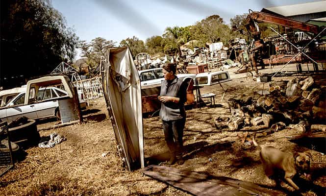 And a white customer goes about rummaging for pieces of items he wants to buy, clearly unperturbed by the coffin. He jokingly remarks "you recycle everything but coffins."