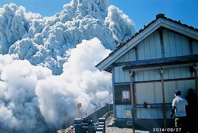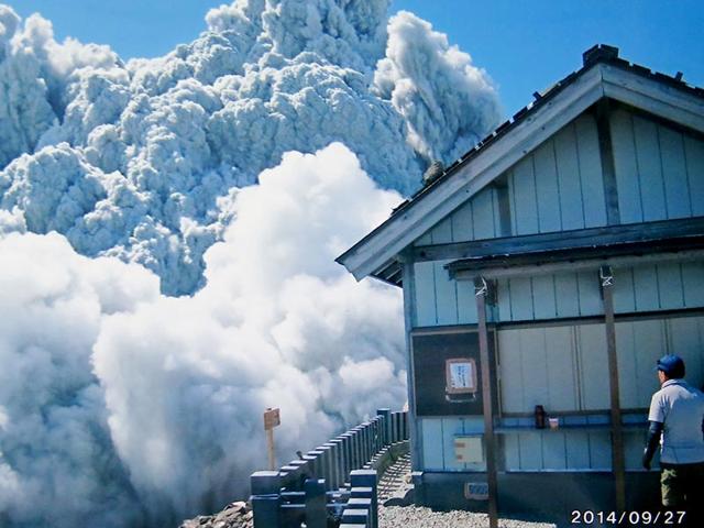 Construction company employee Izumi Noguchi, 59, was climbing alone, as his usual hiking companion, his wife, Hiromi, had to work, she told Japanese broadcaster NHK and other TV stations. His compact camera was banged up, but the memory chip inside was undamaged. She printed all 100 shots. The last one is of an enormous plume billowing from the crater behind a mountaintop lodge.