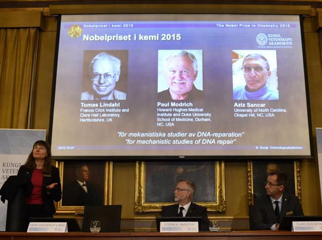 Sweden’s Tomas Lindahl, Paul Modrich of the US and Aziz Sancar, a Turkish-American, won the 2015 Nobel Chemistry Prize on Wednesday for work on how cells repair damaged DNA.