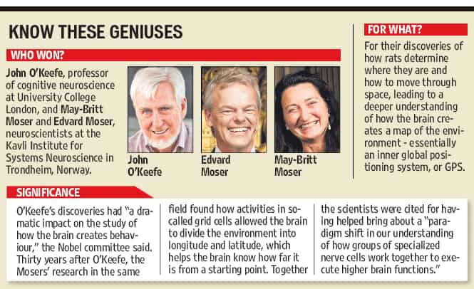 Their findings in rats - and research suggests that humans have the same system in their brains - represented a "paradigm shift" in the knowledge of how cells work together to perform cognitive functions, the Nobel Assembly said, adding that knowing about the brain's positioning system may "help us understand the mechanism underpinning the devastating spatial memory loss" that affects people with Alzheimer's disease.